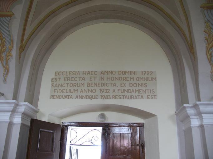 | Keywords: Nemespann templom felirat.jpg  en Ecclesia haec Anno Domini 1722 est erecta et in honorem Omnium Sanctorum benedicta Ex donis Fidelium Anno 1932 a fundamentis renovata Annoque 1983 restaurata est hu a bejárat feletti felirat own Taz 2009 Church of All Saints in Paňa-interior Built in 1722 by country Slovakia Latin inscriptions in Slovakia |