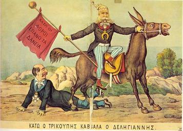 | Keywords: Neos Aristofanis5.jpg  en Greek satirical poster of 1895 depicting Diligiannis and Trikoupis 1895 The flag reads down with the taxes up with the loans el Γελοιογραφία του ' έου Αριστοφάνη'  ου συμβολίζει την  τώση του Τρικού η και την νέα  ολιτική άνοδο του Δηλιγιάννη με  ρόγραμμα λιτότητας και φορολογικής ανακούφησης του λαού Ιστορία του Ελληνικού Έθνους Εκδοτική Αθηνών Αθήνα 1978 ISBN 960-213-110-1 σελ 41 author 1895 δείτε  αρακάτω α ό  έο Αριστοφάνη PD-old 1895 in Greece Charilaos Trikoupis Theodoros Diligiannis Political cartoons of Greece 1890s political cartoons |