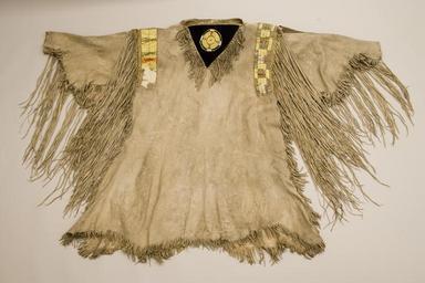 Keywords: NEPE8759 shirtFull.jpg en Ceremonial Shirt Plateau c 1820's Animals provided many of the materials needed for clothing The body of the shirt is made from elk hide and fringes from deer hide The decorative elements are made of porcupine quills Before beads came into the trade networks porcupine quills were used for decoration The quill is a round hollow tube that differs in length and thickness The largest came from the tail and the most delicate from the belly The quills were flattened dyed and sewn into the shirt The shirt is also decorated with Venetian glass beads Deer skin elk skin porcupine quills Erethizon dorsatum wool glass beads W 146 0 L 94 0 cm Nez Perce National Historical Park NEPE 8759 Nez Perce National Historical Park NEPE 8759 Nez Perce 1820 PD-USGov Leather clothing Nez Perce Native American clothing Quillwork Fringes |