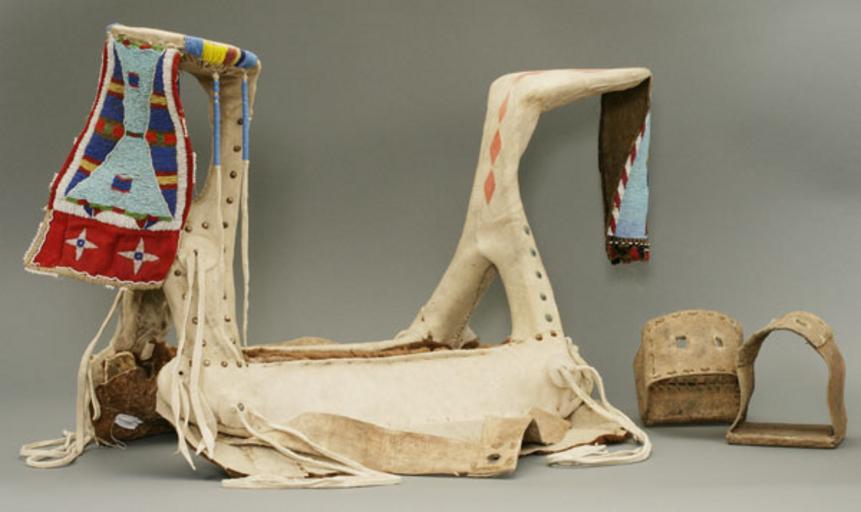 Keywords: NEPE Saddle Woman.jpg en Woman ™s Saddle c 1870-1880s Horses were reintroduced to North America by the Spaniards Many of the horse accoutrements such as this saddle reflect the Spanish roots of the horse The two high projections at the front and back of the saddle are reminiscent of Spanish designs The tree of this women ™s saddle is made from elk antler pieces and wood Rawhide was then stretched over the frame that in turn was covered with brain-tanned buckskin The fenders are bison hide Some of this saddle was made in the 1870s or 80s It was remade in the 1950s adding newer elements to the old The stirrups are made of rawhide with wood footholds Paint tacks wool trade cloth and glass trade beads complete the decorative elements Elk antler Cervus elaphus bison hide Bos bison buckskin H 43 4 W 30 L 72 cm Nez Perce National Historical Park NEPE 8896 Nez Perce National Historical Park NEPE 8896 Nez Perce National Historical Park 1870-1880 PD-USGov Nez Perce Saddles |