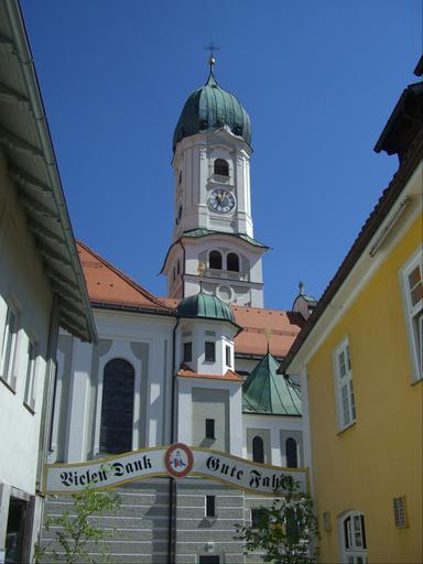 Keywords: nesselwang church steeple tower hood gentian flower-like sky blue