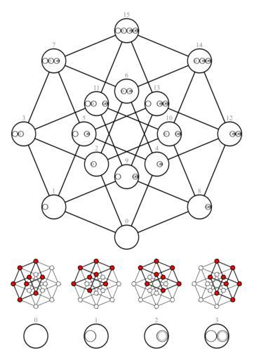| Keywords: Nested set V4; elements in Hasse diagram.svg right 100px v User Lipedia/hat Reverse_binary The subsets of V_4 are numbered in reverse binary order The elements of V<sub>4</sub> - respectively the subsets of V<sub>3</sub> - ordered in a Hasse diagram by inclusion V<sub>4</sub> P 4 P P P P is the powerset of the power set of the power set of the power set of the empty set As many brackets are usually hard to understand the sets are defined by circles instead of brackets The circle containing nothing stands for the empty set The universe <small> the thing all shown sets are a subset from </small> in this Hasse diagram is P 3 and expressed in set brackets it looks like this <nowiki> </nowiki> This system of sets can be used for a set theoretic definition of Boolean functions ValidSVG Inkscape Eigenes Werk own work Mate2code 2009-05-10 Printable version File Nested set V4; elements in Hasse diagram pdf<br> Compare 200px 200px 200px Tesseract Hasse diagrams Tesseract Petrie polygon Nested set V4 Duality A filled with B's filled with scalars reversing A and B |