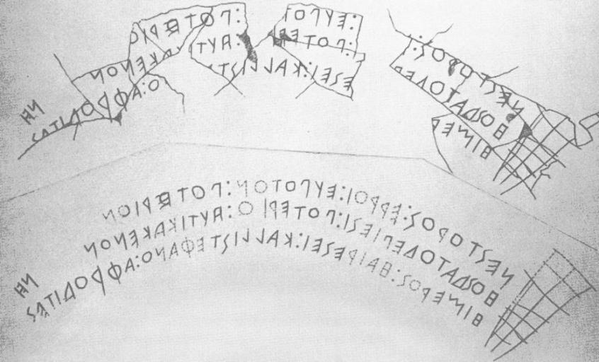 | Keywords: Nestor Cup Cumae.jpg Nestor's Cup inscription Cumae alphabet 8th century BC from a Greek vase from Pithikoussai the older Greek colony in Magna Graecia and Sicily related to and often confused with Cumae upper half drawing of the state of the original inscription; lower half restoration Original ΕΣΤΟΡΟΣ ΕΥΠΟΤ ΠΟΤΕΡΙΟ ΗΟΣΔΑΤΟΔΕΠ ΠΟΤΕΡΙ ΗΥΤΙΚΑΚΕ Ο ΗΙ ΕΡ ΕΣΕΙ ΚΑΛΛΙΣΤΕ Ο ΑΦΡΟΔΙΤΕΣ Restored εστορος ἐρροι εὐ οτον οτηριον ὁσδα τοδε ιεσι οτηριο ηὐτικα κενον ἱμερος αἱρεσει καλλιστεφανο Ἀφροδιτες Source http //www1 union edu/~wareht/greek3/writing_nestor jpg PD-Art See also <gallery> Image Coppa di Nestore png The so-called Nestor's cup from Pithikoussai </gallery> Cup of Nestor Pithecusae Artworks missing infobox template |
