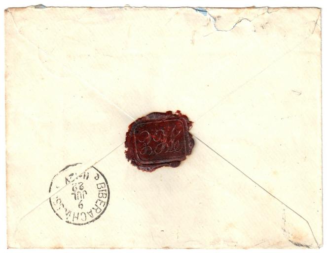 | Keywords: Netherlands 1922-07-07 cover reverse.jpg en Netherlands 1922-07-07 cover sent registered from Borsselen to Biberach Germany Good combination franking of 35c with NVPH 60 and 72 Since this cover was sent registered it has been inspected by currency control authorities in Emmerich Germany circular purple postmark Sent to Dekan dean Scheurlen Paul Eugen Heinrich 25 09 1877 Königsbronn “ 13 12 1947 Biberach an der Riß Backside arrival postmark Biberach 9 JUL 22 and wax seal showing the initials of the sender 'JCE' 1922-07-07 own scan Post of the Netherlands other versions See more images Netherlands 1922-07-07 cover jpg Netherlands 1922-07-07 cover reverse jpg LangSwitch Netherlands 1922-07-07 currency control cover to Biberach Germany Custom license marker 2016 09 11 PD-old Sealing wax Covers of the Netherlands 1922 Postmarks of Biberach an der Riss |