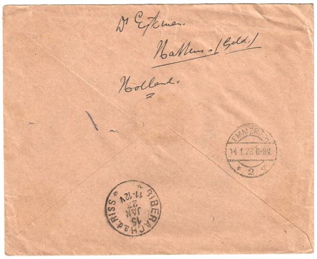 Keywords: Netherlands 1923-01-13 cover reverse.jpg en Netherlands 1923-01-13 cover sent registered from Hattem to Biberach Germany Franking of 35c with NVPH 65 and 81 pair Since this cover was sent registered it has been inspected by currency control authorities in Emmerich Germany Sent to Dekan dean Scheurlen Paul Eugen Heinrich 25 09 1877 Königsbronn “ 13 12 1947 Biberach an der Riß 1923-01-13 own scan Post of the Netherlands other versions Custom license marker 2016 09 11 PD-old Covers of the Netherlands 1923 Postmarks of Biberach an der Riss Postmarks of Emmerich am Rhein |