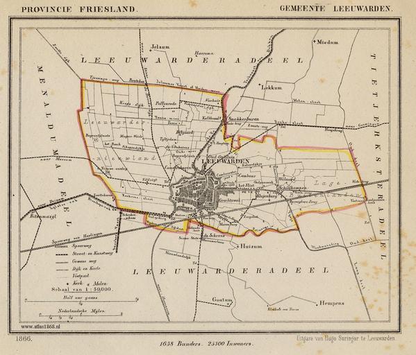 Keywords: Netherlands, Leeuwarden, map of 1866.jpg nl Kaart uit 1866 van de gemeente Leeuwarden Friesland en Map from 1866 of the municipality of Leeuwarden Province of Friesland Netherlands Gemeente-atlas van Nederland naar officieele bronnen bewerkt J Kuyper 1866 Published around 1870 as part of a series of provincial atlases of the Netherlands This image is in the public domain The author J Kuyper died in 1908 In the Netherlands copyright expires 70 years after the death of the author or 70 years after first publication in the case of anonymous or pseudonymous works or works published by a legal entity Het auteursrecht in Nederland vervalt 70 jaar na de dood van de auteur of 70 jaar na de eerste openbaarmaking van het werk indien het gaat om een anoniem of om een onder pseudoniem verschenen werk of werk van een rechtspersoon The church in central Leeuwarden is at 53 12 15 24 N 5 47 50 57 E region NL Old maps of Leeuwarden 1866 Gemeente Atlas van Nederland - Friesland Netherlands in the 1860s PD-old |