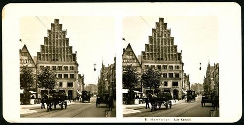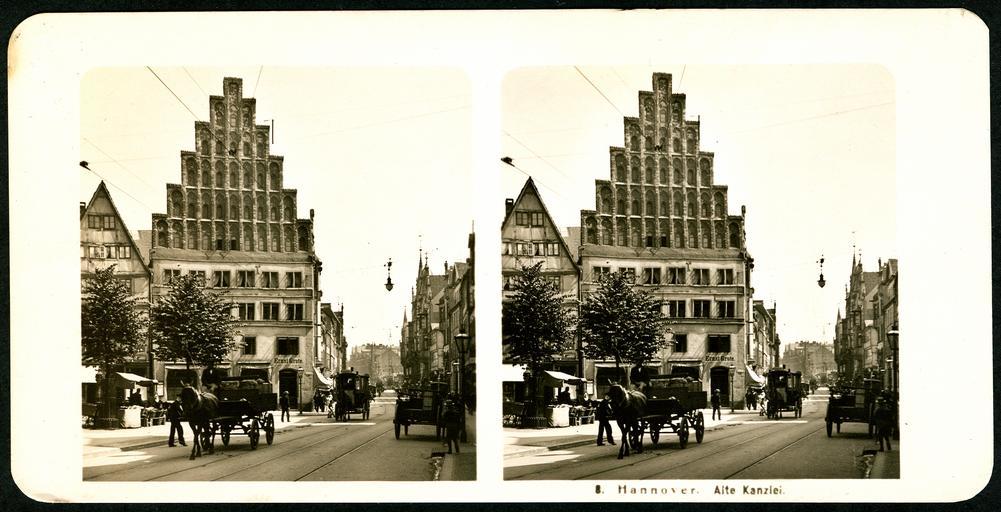 | Keywords: Neue Photographische Gesellschaft Stereoskopie 1907, Hannover 08 Alte Kanzlei Bildseite Blick in Richtung Aegidientorplatz Marienstraße, Marktstand Kutsche Pferdestraßenbahn Ernst Grote.jpg Bildseite mit der laufenden Nummer 8 aus der ab 1907 von der Neuen Photographischen Gesellschaft AG Berlin-Steglitz vertriebenen Stereoskopie-Kartenserie Hannover Der noch unidentifizierte Fotograf stand hier seitlich der Aegidienkirche und fotografierte das Gebäude der Alten Kanzlei mit seinem mittelalterlichen Treppengiebel an der Ecke Osterstraße und weiter durch die Breite Straße in Richtung Aegidientorplatz an dessen Ecke zur Marienstraße offensichtlich gerade ein Bauplatz noch unbebaut ist Im Vordergrund ist links ein bäuerlicher Stand zu sehen der unter einer Plane seine Produkte feilbietet während die Alte Kanzlei bereits von dem Kaffeeröster Ernst Grote genutzt wird An der Straßenecke kommt eine Pferdestraßenbahn aus der Breiten Straße Während die Laternen am Straßenrand sicher noch mit Gas betrieben wurden kündet die über der Straße hängende elektrische Beleuchtung vom Beginn eines neuen technischen Zeitalters Diese Karte wurde freundlicherweise von Ilse Paul zur Verfügung gestellt um sie als Digitalisat über Wikimedia Commons nachhaltig allen Menschen zur Verfügung zu stellen Scan vom Original Bernd Schwabe in Hannover mit Dank an IlsePaul ~ 1907 unknown photographer to Neue Photographische Gesellschaft <gallery> File Neue Photographische Gesellschaft Stereoskopie 1907 Hannover 08 Alte Kanzlei Rückseite mit Namen der Gesellschaft und Erst-Vertriebsdatum blauer Stempel Moskau russisch jpg Revers der Stereoskopie </gallery> PD-old Documents by Ilse Paul Neue Photographische Gesellschaft Berlin Stereo cards of Hannover Alte Kanzlei Hannover Aegidientorplatz Hannover Horses in Hannover Carriages in Germany Horse trams in Hannover |