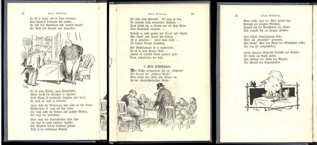| Keywords: NeueAllotria0006h.jpg Georg Bötticher eigener Scan des Buches User Wefo 2011-03-12 This image is in the public domain due to its age Inhalt <ref>vorhergehende Seiten 11 12 13 Abbildung File blau jpg File NeueAllotria0006h jpg dieser Seiten 14 15 16 nachfolgende Seiten 17 18 19 Inhaltsverzeichnis Titelblatt </ref><ref> Erste Strophen von Nr 6 siehe vorhergehende Seite </ref><ref>Er ist so loyal als es einer vermag; <br>Kein Landrat benimmt sich exakter <br>Er liest das Amtsblatt und modelt danach <br>So Geist wie Gemüt und Charakter </ref><ref>Er ist ganz Würde ganz Feierlichkeit <br>Wenn durch die Straßen er schreitet <br>Sein Gang ist machtvoll langsam und breit <br>Er weiß es was er bedeutet </ref><ref>Zwar steht die Bedeutung ihm nicht an der Stirn <br>Geschrieben sie liegt bei ihm tiefer <br>Sie liegt nicht im kleinen und großen Gehirn <br>Sie liegt im Unterkiefer </ref><ref>Man muß den vortrefflichen essen sehn <br> Er thut es wohl sechsmal täglich <br>Ein Nilpferd würde beschämt gestehn <br>Daß seine Leistungen kläglich </ref><ref>Er liebt auch Getränke Es mag ja sein <br>Er wünscht sonst niemandes Schaden ” <br>Doch fürcht ich er könnte um ein Faß Wein <br>Das Vaterland verraten ” </ref><ref>Sobald er nicht gerade mit Trank und Speis' <br>Mit Speis' und Trank sich kräftigt ” <br>Ist er zuweilen ” soviel man weiß ” <br>In seinem Berufe beschäftigt </ref><ref>Als Rechtsanwalt ist er hochbeliebt <br>Er ist in dem kleinen Neste ” <br>Zumal es daselbst keinen zweiten gibt ” <br>Ganz unbestritten der beste <br> ” </ref><ref>7 Beim Frühschoppen </ref><ref>Vor Tische versammeln sich im žSchwan <br>Die Herren der žbesseren Kreise <br>Man frischt hier Geist und Körper an <br>In der allerbescheidensten Weise </ref><ref>Man trinkt was der Wirt gerade hat <br>Genießt ein belegtes Brötchen <br>Erzählt sich die Neuigkeiten der Stadt <br>und erquickt sich an einigen Zötchen </ref><ref>Wer höhere Unterhaltung liebt <br>Wird als žKrakehler gemieden <br>Mit Recht Wer das Wohl der Gesellschaft trübt <br>sei von ihr ausgeschieden </ref><ref>Solch schweres Gespräch bedrückt das Gemüt <br>Es bleibt im Kopfe haften <br>Und schädigt vor allem den Appetit <br>Die schönste der Eigenschaften </ref><ref>8 Die zwei Vereine </ref> Inhalt <references /> PD-old Neue Allotria |