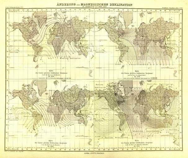 Keywords: Neumayer Atlas des Erdmagnetismus 5.jpg http //hdl handle net/10013/epic 31485 d001 Atlas des Erdmagnetismus Gotha Justus Perthes 20 S 5 Karten pdf 99 MB - No V Änderungen der Magnetischen Deklination Archive/Alfred Wegener Institute 1891 Georg Neumayer Author died more than 70 years ago - public domain PD-old Magnetic field maps of the world |