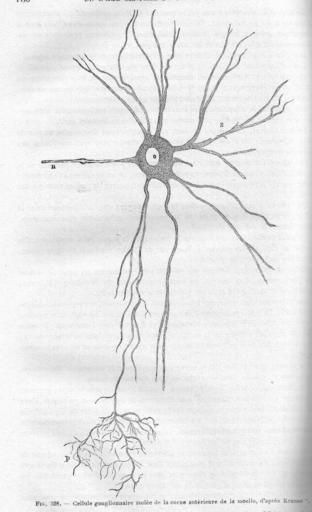 | Keywords: NeuroneChauveau1890MeyCh.jpg en A neuron fr Un neurone une cellule ganglionnaire isolée de la corne antérieure de la moelle <br /> -o noyau entouré par le corps cellulaire -n prolongement cylindraxile ou de Deiters ou cylindraxe ou axone -z prolongements protoplasmiques ou dendrites qui se subdivisent en plusieurs ramifications P -P arborisation terminale <br /> ” Chauveau Auguste Arloing Saturnin Traité d'anatomie comparée des animaux domestiques <br /> 1 064 p page 760 1890 Paris Lib J B Baillière et Fils domaine public décès des auteurs 1917 et 1911 Meyer Ch 2011-03-24 PD-old Neurons Histology |