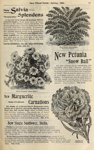| Keywords: New floral guide (16240888364).jpg New Floral Guide Spring 1901 <br> 97 <br> New <br> Cal via ’ ’ ’ ’ <br> oop sp es-5plendens <br> A splendid new large flowering Salvia <br> Scarlet Sag-e ; bears three times as many <br> flowers as the ordinary Salvia Splendens the <br> flower spikes being so heavily laden they droop <br> gracefully with their own weight It is exceed- <br> ingly handsome and desirable for lawn or gar- <br> den whether planted singly or in groups with <br> other flowers The flowers are intense daz <br> zling scarlet and are borne in endless profu- <br> sion until late in the Fall one of the most <br> beautiful Autumn-blooming flowers you can <br> have Pkt 75 seeds 8 cts <br> Salvia Splendens the old large-flowering' <br> kind pkt 4c <br> New Salvia Splendens <br> Drooping Spikes <br> New Petunia <br> Snow Ball <br> We take pleasure in recommending this <br> beautiful Snow Ball Petunia The illus- <br> tration is a reproduction from photograph <br> showing its dwarf bushy habit and abundance <br> of bloom The flowers are pure snow white <br> of good shape and size sweet scented and <br> lasting It stands heat and drought well and <br> has few equals among pure white flowers <br> For beds and borders should be extensively <br> planted Sure to please Pkt 6 CtS <br> New Petunia ’'Snow Ball ' <br> New Marguerite <br> Giants of California <br> Carnations <br> The Giants of California Dwarf Marguerite Carna- <br> nations are a splendid new strain bearing flowers of <br> Giant size full reΒ§ ular form many beautiful colors <br> and delicious fragrance The plants are of dwarf <br> bushy growth very free flowering and easy to grow <br> and as they bloom as quick as other Marguerite Car- <br> nations they are a most desirable novelty Pkt 8 CtS <br> New Single Sunflower Stella <br> Stella is a beautiful new variety makes neat bushy plants <br> 3 to 4 feet high with small bright green leaves and covered <br> all over with fine large single yellow flowers with coal-black <br> centres Very showy and handsome and easy to grow Pkt 5 <br> cts Yz oz 20 cts <br> New Clirysaiitliemuin Flowerefl- Sunflower grows 6 to 7 <br> feet high and blooms profusely the whole season Flowers six to seven <br> inches across perfectly double pure bright golden yellow and so rich and <br> beautiful they resemble immense Chrysanthemums Very showy and hand- <br> some Pkt 8 Cts <br> Giants of <br> California 42484259 134532 67120 Page 97 Text http //www biodiversitylibrary org/page/42484259 1901 10 1111/j 1469-7998 1865 tb02381 x Conard Jones Co West Grove Pa ; Henry G Gilbert Nursery and Seed Trade Catalog Collection NameFound Carna NameConfirmed Carna EOLID 8886074 NameBankID 2992271 NameFound Petunia NameConfirmed Petunia Juss EOLID 60149 NameFound Salvia NameConfirmed Salvia L EOLID 38380 NameFound Splendens NameConfirmed SPLENDENS NameBankID 5329910 Biodiversity Heritage Library New floral guide 1901 Garden Stories Bulbs Plants Catalogs Nursery stock Plants Ornamental Roses Seeds U S Department of Agriculture National Agricultural Library bhl page 42484259 dc identifier http //biodiversitylibrary org/page/42484259 Conard Jones Co Flowers West Grove PA Conard Jones Co bhlGardenStories BHLinbloom bulbs plants plants ornamental u s department of agriculture national agricultural library west grove pa conard jones co bhlgardenstories bhlinbloom Information field Flickr posted date ISOdate 2015-03-19 Check categories 2015 August 23 CC-BY-2 0 BioDivLibrary https //flickr com/photos/61021753 N02/16240888364 2015-08-23 23 55 39 cc-by-2 0 PD-old-70-1923 New floral guide 1901 Photos uploaded from Flickr by FΓ¦ using a script |