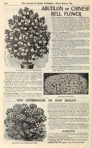 | Keywords: New floral guide (16243294773).jpg 104 <br> The Cotiard Jones Company West Grove Pa <br> AbutilLHi or Chiuese JBell Flower <br> AMARANTHUS RAINBOW- Verj- beautiful and the <br> finest of all the Amaranths ; two to three feet high ; <br> fine pyramid form each leaf two colors half black <br> and half green changing in August to bright scarlet <br> rose pink yellow etc making a blaze of colors <br> which few other plants can equal Pkt 4 cts <br> ALYSSUM LITTLE GEM Much larger and finer <br> than the old kind ; blooms constant - all Summer <br> and Fall ; a sheet of pure white flowers deliciously <br> sweet Pkt 5 cts ; Yz oz 25 cts <br> ALYSSUM GOLDEN SAX ATILE Brilliant golden <br> yellow flowcs completely hiding the foliage ; grows <br> about one foot high ; fine for rock-work and quite <br> showy in masses Pkt 6 cts <br> ALYSSUM SWEET A great fa 'orite very popular ; <br> grows easily ever 'where ; covered with pure white fra- <br> grant flowers thewhole season Pkt 3 cts ; oz 25 cts <br> ABUTILON or CHINESE <br> BELL FLOWER <br> ABUTILON Chinese Bell Flower or Flowering Ma- <br> ple as it is sometimes called is a beautiful plant for <br> house or window ; may be bedded out in Summer and <br> taken up in Winter ; grows easily from seed and <br> blooms very quickly Lovely bell-shaped flowers <br> borne all the year Colors Pink yellow orange <br> red white etc The leaves are also beautifully mottled <br> and variegated with green white and 3-ellow and are <br> almost as prettj- as the flowers It bears hard usage <br> veil and alvrays looks bright and handsome Fine <br> mixed pkt 6 cts 3 pkts for 15 cts <br> ACACIA FARNESIANA A very beautiful easily <br> grown plant that should be better known delicate <br> fern-like foliage and charming tassel-like golden yel- <br> low flowers deliciousy fragrant should be started <br> early in-doors Pkt 6 cts <br> ACROCLINIUM Everlasting or PINK DAISY Con- <br> sidered one of the most beautiful everlasting flowers <br> we have ; grows one foot high ; color elegant pale <br> pink shading to rose; fine for bedding and borders <br> and when dried makes lovely Winter bouquets New <br> double mixed colors Pkt 4 cts <br> AMBROSIA A fine hardy annual with long spiral <br> stems bearing small 3'ellow flowers of most delicious <br> fragrance fully equal to the rose geranium for floral <br> work but a different perfume Seed may be sown <br> early in open ground It is easily grown and needs <br> little care Pkt 4 cts <br> ANCHUSA CAPENSIS or Large flowering Forget- <br> me-not A fine hardy annual grows about two feet <br> high branches freely and bears a profusion of lovely <br> sky blue flowers each with a clear white eye ; bloo ns <br> early and continuously all Summer fine for cuttirg <br> and bouquets Pkt 4 cts <br> AMARANTHUS GIBBOSIS A very handsome Orna- <br> mental foliage plant with long drooping tassels of <br> purplish red flowers frequently two and a half feet <br> long Pkt 3 cts <br> Alyssum Little Gem <br> NEW ANTIRRHINUMS OR SNAP DRAGON <br> Hardly any flowers grown from seed are more handsome <br> and showy for Summer Beds and Borders than the New An- <br> tirrhinums or Snap Dragon The flowers are borne in tall <br> graceful spikes excellent for cutting Some are deliciously <br> sweet-scented and the colors are exquisite They are easy <br> to grow bloom very quickly and sure to be greatly admired <br> NEW SNAP DRAGON QUEEN OF THE NORTH A <br> splendid new variety of greatest beauty The plants make <br> pretty bushes 12 to 15 inches high covered with large <br> white flowers deliciously sweet fine for bedding and pot- <br> culture Pkt 6 cts <br> NE V GIANT-FLOWERING SNAP DRAGON grows 18 <br> to 20 inches high covered with large splendid flowers of <br> many superb colors mixed ; fine for beds and borders <br> Pkt 3 cts ; Y oz- 15 cts <br> NEW DWARF or TOM THUMB SNAP DRAGON grows <br> onlv 8 inches high thickly covered with beautiful spikes <br> of gay colored flowers orange scarlet pure white maroon <br> striped etc splendid for beds and edging Pkt 8 cts ; J <br> oz 20 cts <br> AGERATUM <br> Agerstum iยปwยซrf Imperial Blue <br> The Ageratvims are very effective plants for beds and bor- <br> ders Their prettj' flowers and leaves completely hide the <br> o-round all Summer and Fall <br> IMPERIAL DWARF BLUE grows six inches high ; excel- <br> lent for ribbon borders Pkt 5 cts <br> IMPERIAL DWARF WHITE Like the above except ia <br> color Pkt 5 cts <br> AGERATUM-Fine mixed Pkt 3 cts ; y oz 15 cts 42484266 134532 67120 Page 104 Text http //www biodiversitylibrary org/page/42484266 1901 10 1111/j 1469-7998 1865 tb02381 x Conard Jones Co West Grove Pa ; Henry G Gilbert Nursery and Seed Trade Catalog Collection NameFound Abutilon NameConfirmed Abutilon hybrid EOLID 71367 NameFound Acacia farnesiana NameConfirmed Acacia farnesiana EOLID 11222084 NameBankID 2650829 NameFound Acroclinium NameConfirmed Acroclinium EOLID 6262186 NameBankID 1674219 NameFound Acroclinium NameConfirmed Acroclinium EOLID 6262186 NameBankID 4850542 NameFound Ageratum NameConfirmed Ageratum L EOLID 59467 NameFound Alyssum NameConfirmed Alyssum L EOLID 39058 NameFound Amaranthus NameConfirmed Amaranthus EOLID 37601 NameBankID 2646887 NameFound Amaranthus gibbosis NameConfirmed Panacanthus gibbosus Montealegre-Z G K Morris 2004 NameFound Anchusa capensis NameConfirmed Anchusa capensis EOLID 596328 NameBankID 2663402 NameFound Orna NameConfirmed Orna EOLID 47655 NameBankID 3009473 Biodiversity Heritage Library New floral guide 1901 Garden Stories Bulbs Plants Catalogs Nursery stock Plants Ornamental Roses Seeds U S Department of Agriculture National Agricultural Library bhl page 42484266 dc identifier http //biodiversitylibrary org/page/42484266 Conard Jones Co Flowers West Grove PA Conard Jones Co bhlGardenStories BHLinbloom bulbs plants plants ornamental u s department of agriculture national agricultural library west grove pa conard jones co bhlgardenstories bhlinbloom