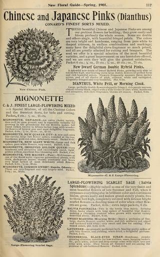 | Keywords: New floral guide (16243325523).jpg New Floral Guide Spring 1901 <br> 117 <br> Chinese and Japanese Pinks Dianthus <br> COWARD'S FINEST SORTS MIXED <br> THESE beautiful Chinese and Japanese Pinks are among <br> our prettiest flowers for bedding ; they grow easily and <br> bloom profusely the whole season Some are double <br> and others single with beautiful fringed petals The colors <br> are very bright and handsome ranging from pure white to <br> deepest crimson in endless combinations and markings; <br> many have the delightful clove fragrance so much prized <br> and all are greatly admired for cutting and bouquets The <br> seed we offer is a special selection of the most beautiful <br> varieties and a great improvement on any heretofore offered <br> and we are sure they will give the greatest satisfaction <br> Packet 6 cts ; oz 25 cts ; oz 40 cts ; oz 75 cts <br> New Dwarf German Double Hybrid Pinks <br> A Splendid new strain of Dwarf Hybrid Pinks growing only nine or <br> ten inches high and bearing extra large double flowers of perfect form <br> and rich beautiful colors Flowers frequently measure three inches <br> across and of all shades of pink crimson white and variegated <br> Elegantly fringed and very beautiful Pkt 6 cts <br> DIANTHUS White Frill or Morning Cloak <br> I arge perfectly double flowers elegantly fringed rich purple maroon <br> almost velvety black edged with a wide border of pure white handsome <br> and attractive rich clove fragrance blooms all season Packet 6 cts <br> New Chinese Pink <br> MIGNONETTE <br> C J FINEST LARGE-FLOWERING MIXED <br> A Special Mixture of all the Choicest Colors <br> and the Sweetest Sorts for beds and cutting <br> Packet 6 cts ; J oz 25 cts <br> MIGNONETTE DEFIANCE An extra choice variety <br> does well in open ground and is especially valuable for <br> growing in the greenhouse for cut flowers makes full <br> round spikes twelve to fifteen inches long with wonder- <br> ful flowers of largest size and most delightful fragrance <br> Packet 6 cts ; oz 35 cts ; oz 65 cts <br> MIGNONETTE NEW QUAKER CITY A new and extra <br> fine variety large full flower spikes rounded at the top- <br> handsome gold-red color deliciously sweet Packet 4 cts ' <br> MIGNONETTE NEW GIANT WHITE-I arge and fulL <br> spikes pure white flowers very sweet Packet 4 cts <br> MIGNONETTE IMPROVED GOLDEN QUEEN Very <br> handsome and attractive and exceedingly sweet light <br> golden yellow excellent free-blooming sort Packet 4 cts' <br> MIGNONETTE THE MACHET Pure Well-known as <br> one of the finest sorts; vigorous pyramidical plants with <br> thick dark-green leaves; blooms constantly and bears <br> very large spikes of most deliciously sweet flowers <br> Packet 4 cts ; Yz oz 20 cts <br> MIGNONETTE COMMON SWEET Reseda Odorata <br> These are very fragrant and very largely used Packet <br> Sets ; oz 10 cts <br> Mig nonette C J Large-FIo vering <br> liarge -Flowering Scarlet Sage <br> LARGE FLOWERING SCARLET SAGE Salvia <br> Splenuens Highly valued as one of the very finest and <br> most beautiful flowers of late Summer and Fall when it <br> surpasses everything else in brilliant color and continuous <br> bloom grows easily and makes grand stately plants two <br> to three feet high completely covered with intense bright <br> scarlet flowers a dazzling mass of color when other flow- <br> ers are gone Packet 4 cts ; extra large packets 6 cts <br> SALVIA FARINACEA This is the lovely blue Salvia forming <br> dense bushy plants with long spikes of beautiful blue flowers <br> making a charming contrast wlien grown with scarlet variety <br> described above Packet 6 cts <br> SWEET SCABIOSA Mourning Bride Bears a profusion of fine <br> large double flowers ; scarlet white and rich mulberry red edged <br> and bordered with white ; very sweet and fine for cutting Fine <br> mixed colors pkt 4 cts esch <br> LAVENDER An aromatic medicinal herb bearing pretty spikes of <br> pale blue flowers and yielding when dried a delightful perfume <br> Packet 5 cts <br> THUNBERGIA BLACK-EYED SUSAN Handsome slender <br> growing climbers suitable for low trellises vases hanging baskets <br> etc pure white yellow and deep orange some with black eyes and <br> some with white They bloom all Summer and are among the <br> prettiest of old-fashioned flowers Packet 4 cts 42484279 134532 67120 Page 117 Text http //www biodiversitylibrary org/page/42484279 1901 10 1111/j 1469-7998 1865 tb02381 x Conard Jones Co West Grove Pa ; Henry G Gilbert Nursery and Seed Trade Catalog Collection NameFound Dianthus NameConfirmed Dianthus EOLID 11254753 NameBankID 2646562 NameFound Reseda NameConfirmed Reseda EOLID 11256744 NameBankID 2649014 NameFound Salvia NameConfirmed Salvia L EOLID 38380 NameFound Salvia farinacea NameConfirmed Salvia farinacea EOLID 578463 NameBankID 2655304 NameFound Scabiosa NameConfirmed Scabiosa 'Simon Greaves' EOLID 49101 NameFound Thunbergia NameConfirmed Thunbergia Retz EOLID 60654 Biodiversity Heritage Library New floral guide 1901 Garden Stories Bulbs Plants Catalogs Nursery stock Plants Ornamental Roses Seeds U S Department of Agriculture National Agricultural Library bhl page 42484279 dc identifier http //biodiversitylibrary org/page/42484279 Conard Jones Co Flowers West Grove PA Conard Jones Co bhlGardenStories BHLinbloom bulbs plants plants ornamental u s department of agriculture national agricultural library west grove pa conard jones co bhlgardenstories bhlinbloom Information field Flickr posted date ISOdate 2015-03-19 Check categories 2015 August 23 CC-BY-2 0 BioDivLibrary https //flickr com/photos/61021753 N02/16243325523 2015-08-23 23 50 41 cc-by-2 0 PD-old-70-1923 New floral guide 1901 Photos uploaded from Flickr by FĂŚ using a script |
