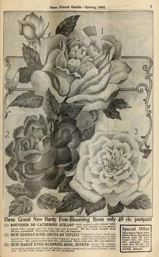 | Keywords: New floral guide (16677004729).jpg New Floral Quide ” Spring 190L <br> Three Grand New Hardy Ever-Blooming Roses only 40 cts postpaid <br> 1 SOUVENIR DE CATHERINE GUILLOT- ch coppeg jom <br> tinted with orange and red very rare and beautiful 30 cts each; larger siz6» <br> 25 cts postpaid Two-year size 35 cts by express <br> NEW GERMAN ROSE GRUSS AN TEPLITZ 5 ° t- to wm <br> crimson changing to bright <br> scarlet and velvety fiery red one of the brightest; fiovrers large full and sweet blooms <br> all season 20c each; larger size 25c postpaid Two-year size 40c by express <br> NEW HARDY EVER-BLOOMING ROSE ZEPHYR- J f f JiJ S f <br> ivory white shaded with blush and sulphur yellow hardy and a constant bloomer extra <br> fine 15 cts each; larjjer size 20 cts postpaid <br> 2 <br> 3 <br> Special Offer <br> This Set of Three New <br> Hardy Ever-blooming <br> Roses only 40 cts ; <br> larger size the 3 for <br> 50c postpaid Two- <br> year size 85 cts by <br> express purchaser <br> paying charges 42484169 134532 67120 Page 7 Text http //www biodiversitylibrary org/page/42484169 1901 10 1111/j 1469-7998 1865 tb02381 x Conard Jones Co West Grove Pa ; Henry G Gilbert Nursery and Seed Trade Catalog Collection Biodiversity Heritage Library New floral guide 1901 Garden Stories Bulbs Plants Catalogs Nursery stock Plants Ornamental Roses Seeds U S Department of Agriculture National Agricultural Library bhl page 42484169 dc identifier http //biodiversitylibrary org/page/42484169 Conard Jones Co Flowers West Grove PA Conard Jones Co bhlGardenStories BHLinbloom bulbs plants plants ornamental u s department of agriculture national agricultural library west grove pa conard jones co bhlgardenstories bhlinbloom Information field Flickr posted date ISOdate 2015-03-19 Check categories 2015 August 23 CC-BY-2 0 BioDivLibrary https //flickr com/photos/61021753 N02/16677004729 2015-08-23 23 55 57 cc-by-2 0 PD-old-70-1923 New floral guide 1901 Photos uploaded from Flickr by Fæ using a script |