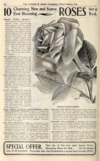 MAKE A MEME View Large Image New floral guide (16837301406).jpg 24 <br> The Conard Jones Company West Grove Pa <br> i \ Charming New and Scarce <br> \\J Ever Blooming <br> Sweet Little Queen ” <br> This is a very dainty and at- <br> tractive Rose grows neat <br> and ...