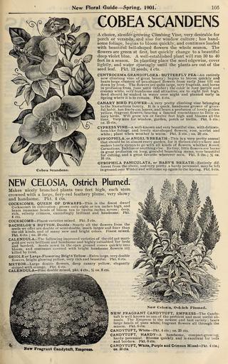 | Keywords: New floral guide (16862238251).jpg New Floral Guide Spring 1901 <br> 105 <br> Cobea Scandens <br> COBEA SCANDENS <br> A choice slender-growing Climbing Vine very desirable for <br> porch or veranda and also for window culture; has hand- <br> some foliage begins to bloom quickly and continues loaded <br> with beautiful bell-shaped flowers the whole season The <br> flowers are green at first but quickly change to a beautiful <br> deep violet blue A well-established plant will run 30 to 40 <br> feet in a season In planting place the seed edgewise cover <br> lightly and water sparingly until the plants are out of the <br> seed leaf Pkt 12 seeds 4 cts <br> CENTROCEMA GRANDIFLORA BUTTERFLY PEA An entirely <br> new climbing vine of great beauty ; begins to bloom quickly and <br> bears large cluster of pea-shaped flowers from early June till cut <br> down by frost The flowers are quite large very fragrant and borne <br> in profusion from June until October ; the color is rosy purple and <br> creamy white very handsome and attractive six to eight feet high <br> Seed shovild be soaked in water over night and planted early in <br> Spring where it is to remain Pkt 4 cts <br> CANARY BIRD FLOWER A very pretty climbing vine belonging <br> to the Nasturtium family It is a quick handsome grower of grace- <br> ful habit has finely-cut leaves and bears a profusion of lovely golden <br> yellow fragrant flowers bearing a fancied resemblance to little ca- <br> nary birds Will grow ten or twelve feet high and blooms all the <br> time Very nice for window garden porch or trellis Pkt 5 cts ; <br> oz 35 cts <br> CYPRESS VINE A well-known and very beautiful vine with delicate <br> fern-like foliage and lovely star-shaped flowers rose scarlet and <br> white ; plant when weather is warm Pkt 3 cts ; oz 20 cts <br> GYPSOPHILA or ANGEL'S BREATH This is a very pretty annual <br> that should be in almost every garden for it thrives everywhere and <br> makes lovely sprays to go with all kinds of flowers whether RoseS <br> Carnations Dahlias or anything else Its tiny little flowers are borne <br> in great profusion on long graceful branching stems very beautiful <br> for cutting and a great favorite wherever seen Pkt 5 cts ; J oz <br> 10 cts <br> GYSOPHILA PANICULATA or BABY'S BREATH Entirely dif- <br> ferent from the above and very pretty a hardy perennial maybe left <br> in ground over Winter and will come up again in the Spring Pkt 5 cts <br> NEW CELOSiA Ostrich Plumed <br> Makes nicely branched plants two feet high each stem <br> crowned with a large fiery-red feathery plume very showy <br> and handsome Pkt 4 cts <br> COCKSCOMB QUEEN OF DWARFS This is the finest dwarf <br> Cockscomb in cultivation ; grows only eight or ten inches high and <br> bears immense heads of bloom ten to twelve inches across ; deep <br> rich velvety crimson exceedingly brilliant and handsome Pkt <br> 4 cts <br> COCKSCOMB Finest varieties mixed Pkt 3 cts <br> BACHELOR'S BUTTON Double Nearly all the flowers from the <br> seeds we offer are double or semi-double much larger and finer than <br> the old kinds and of many new and bright colors Finest mixed <br> Pkt 4 cts ; oz 20 cts <br> CALENDULA The following improved varieties of the old pot mari- <br> gold are very brilliant and handsome and highly valuabled for beds <br> and borders Seeds sown in the open ground comes quickly into <br> bloom and continues covered with bright handsome flowers till <br> killed by frost <br> ORIOLE or Large-Flowering Bright Yellow Extra large very double <br> flowers bright glowing yellow very rich and beautiful Pkt 6 cts <br> METEOR Large double flowers deep canary yellow elegantly <br> striped with orange Pkt 4 cts <br> CALENDULA Fine double mixed pkt 4 cts oz 8 cts <br> New Fragrant Candytaft Empreia <br> Neiv Celosia Ostiicli Plumed <br> NEW FRAGRANT CANDYTUFT EMPRESS The Candy- <br> tuft is well known as one of the prettiest and most useful an- <br> nuals The Empress is the newest and best variety ; bears <br> large heads of pure white fragrant flowers all through the <br> season Pkt 6 cts <br> CANDYTUFT White Pkt 4 cts ; oz 20 cts <br> CANDYTUFT HARDY A handsome compact-growing <br> hardy perennial Blooms quickly and is excellent for beds <br> and borders Pkt 6 cts <br> CANDYTUFT White Purple and Crimson Mixed Pkt 4 cts ; <br> oz 20 cts 42484267 134532 67120 Page 105 Text http //www biodiversitylibrary org/page/42484267 1901 10 1111/j 1469-7998 1865 tb02381 x Conard Jones Co West Grove Pa ; Henry G Gilbert Nursery and Seed Trade Catalog Collection NameFound Calendula NameConfirmed Calendula EOLID 59414 NameBankID 25725 NameFound Celosia NameConfirmed Celosia L EOLID 38393 NameFound Cobea NameConfirmed Cobea NameBankID 8616215 NameFound Cobea scandens NameConfirmed Cobaea scandens EOLID 6359727 NameBankID 1672054 NameFound Gypsophila NameConfirmed Gypsophila EOLID 59327 NameBankID 2646576 Biodiversity Heritage Library New floral guide 1901 Garden Stories Bulbs Plants Catalogs Nursery stock Plants Ornamental Roses Seeds U S Department of Agriculture National Agricultural Library bhl page 42484267 dc identifier http //biodiversitylibrary org/page/42484267 Conard Jones Co Flowers West Grove PA Conard Jones Co bhlGardenStories BHLinbloom bulbs plants plants ornamental u s department of agriculture national agricultural library west grove pa conard jones co bhlgardenstories bhlinbloom Information field Flickr posted date ISOdate 2015-03-19 Check categories 2015 August 23 CC-BY-2 0 BioDivLibrary https //flickr com/photos/61021753 N02/16862238251 2015-08-23 23 50 38 cc-by-2 0 PD-old-70-1923 New floral guide 1901 Photos uploaded from Flickr by FĂŚ using a script |