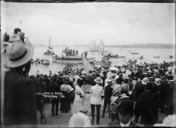 | Keywords: blackandwhite monochrome black and white View of the crowd standing close to the water's edge watching the activity on board yachts and boats near to the shore. Taken from behind the crowd and looking out to sea. Possibly the ocassion was the New Year's Day regatta. Taken by William A Price, on 1 Jan 1914? Inscriptions: Inscribed - Photographer's title on negative -bottom centre: Shelly Beach. Ponsonby. 1754. Quantity: 1 b&w original negative(s). Physical Description: Dry plate glass negative 4.5 x 6.5 inches New Year's Day at Shelly Beach, Auckland. Price, William Archer, 1866-1948 :Collection of post card negatives. Ref: 1/2-001673-G. Alexander Turnbull Library, Wellington, New Zealand. natlib.govt.nz/records/22895341 View of the crowd standing close to the water's edge watching the activity on board yachts and boats near to the shore. Taken from behind the crowd and looking out to sea. Possibly the ocassion was the New Year's Day regatta. Taken by William A Price, on 1 Jan 1914? Inscriptions: Inscribed - Photographer's title on negative -bottom centre: Shelly Beach. Ponsonby. 1754. Quantity: 1 b&w original negative(s). Physical Description: Dry plate glass negative 4.5 x 6.5 inches New Year's Day at Shelly Beach, Auckland. Price, William Archer, 1866-1948 :Collection of post card negatives. Ref: 1/2-001673-G. Alexander Turnbull Library, Wellington, New Zealand. natlib.govt.nz/records/22895341 |