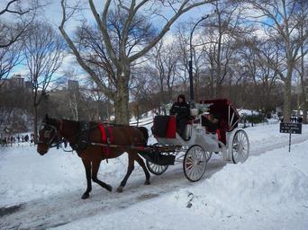 Keywords: new york city horse carriage buggy winter snow ice ride people trees outside urban lane road street downtown romantic