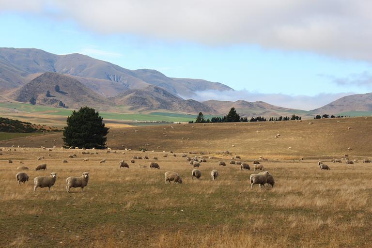 Keywords: new zealand sheep autumn south island mountains graze clouds