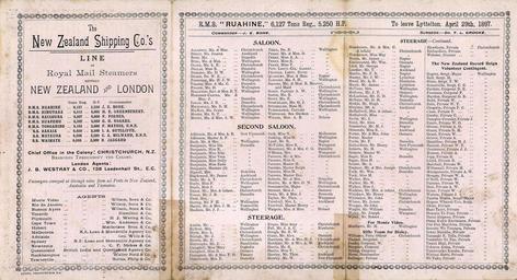 | Keywords: document text Inside is a list of the company's agents around the world, and a list of the passengers in Saloon, Second saloon, Steerage. Lists a rifle team going to Bisley, a passenger (Mr M Matthews) to Montevideo, and the members of the New Zealand Record Reign Volunteer contingent going on the "Ruahine" to Queen Victoria's jubilee, leaving Lyttelton on 29 April 1897. Quantity: 1 b&w photo-mechanical print(s) on inside of very pale pink booklet.. Physical Description: Letterpress on folded brochure 207 x 380 mm (open) New Zealand Shipping Company Limited :New Zealand Line. List of passengers. [R.M.S. "Ruahine". Inside spread]. 1897.. New Zealand Shipping Company Limited :New Zealand Line. List of passengers. 1897.. Ref: Eph-A-SHIP-1897-01-inside. Alexander Turnbull Library, Wellington, New Zealand. natlib.govt.nz/records/22880560 Inside is a list of the company's agents around the world, and a list of the passengers in Saloon, Second saloon, Steerage. Lists a rifle team going to Bisley, a passenger (Mr M Matthews) to Montevideo, and the members of the New Zealand Record Reign Volunteer contingent going on the "Ruahine" to Queen Victoria's jubilee, leaving Lyttelton on 29 April 1897. Quantity: 1 b&w photo-mechanical print(s) on inside of very pale pink booklet.. Physical Description: Letterpress on folded brochure 207 x 380 mm (open) New Zealand Shipping Company Limited :New Zealand Line. List of passengers. [R.M.S. "Ruahine". Inside spread]. 1897.. New Zealand Shipping Company Limited :New Zealand Line. List of passengers. 1897.. Ref: Eph-A-SHIP-1897-01-inside. Alexander Turnbull Library, Wellington, New Zealand. natlib.govt.nz/records/22880560 |