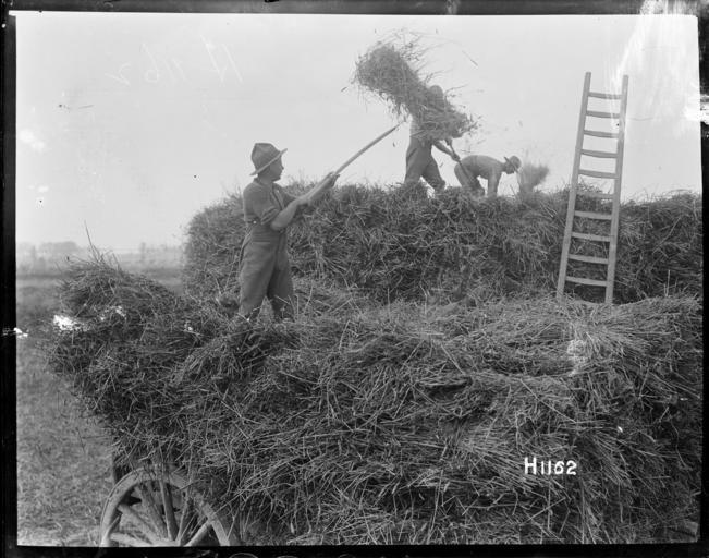 Keywords: blackandwhite monochrome photo border outdoor black and white New Zealand soldiers with pitch forks pile hay onto a haystack to help local French farmers with the harvest in World War I. Photograph taken 25 August 1917 by Henry Armytage Sanders. Inscriptions: Inscribed - Photographer's title on negative -bottom right: H1162. Quantity: 1 b&w original negative(s). Physical Description: Dry plate glass negative 4 x 5 inches New Zealand soldiers helping with the local harvest in World War I. Royal New Zealand Returned and Services' Association :New Zealand official negatives, World War 1914-1918. Ref: 1/2-013711-G. Alexander Turnbull Library, Wellington, New Zealand. natlib.govt.nz/records/22808379 New Zealand soldiers with pitch forks pile hay onto a haystack to help local French farmers with the harvest in World War I. Photograph taken 25 August 1917 by Henry Armytage Sanders. Inscriptions: Inscribed - Photographer's title on negative -bottom right: H1162. Quantity: 1 b&w original negative(s). Physical Description: Dry plate glass negative 4 x 5 inches New Zealand soldiers helping with the local harvest in World War I. Royal New Zealand Returned and Services' Association :New Zealand official negatives, World War 1914-1918. Ref: 1/2-013711-G. Alexander Turnbull Library, Wellington, New Zealand. natlib.govt.nz/records/22808379 |