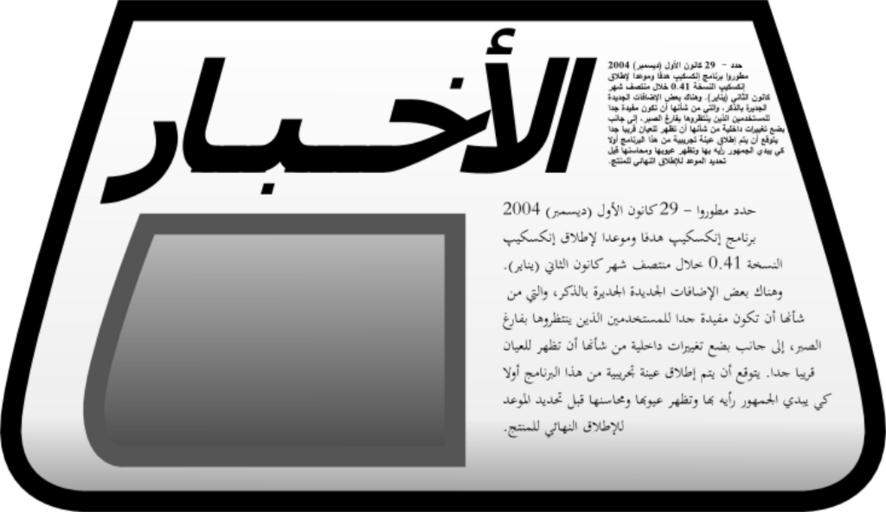 | Keywords: News-ar.svg ar رسم ببرنامج إنكسكيپ لِجريدة 2016-01-23 Derivative from this file Original OpenClipart Derivative باسم other versions English Français português Translated to Arabic - عُرِّبت باسم News svg Custom license marker 2016 01 23 PD-OpenClipart Newspaper icons Topic symbols |