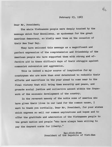 Keywords: Ngo-dinh Diem Letter to John F. Kennedy February 23, 1963 - NARA - 193707.tif Scope and content Letter from President Diem to President Kennedy thanking him for his message concerning the Tet New Year General notes 193707 Local identifier President 1961-1963 Kennedy Office of the Personal Secretary 1961 - 1963 John F Kennedy Library NLJFK Columbia Point Boston MA 02125-3398 1963-02-23 Record group Collection JFK-POF Papers of John F Kennedy President's Office Files 01/20/1961 - 11/22/1963 Record group ARC 1166 Papers of President Kennedy President's Office Files Countries compiled 01/20/1961 - 11/22/1963 Series ARC 193654 File unit Papers of President Kennedy President's Office Files Countries Vietnam General 1963 1963 - 1963 File unit ARC 193703 Variant control numbers NAIL Control Number NLK-POF-CNTRYS-VTNMGNRAL1963-LTRDIEMTOJFK yes Other versions NARA-cooperation PD-USGov Documents in English Ngo Dinh Diem Documents related to John F Kennedy 1963 letters |