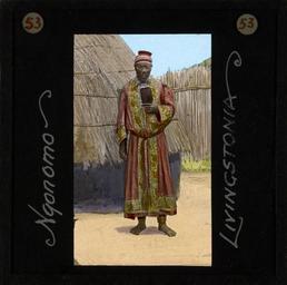 | Keywords: "Ngonomo, Livingstonia" Malawi, ca.1895 (imp-cswc-GB-237-CSWC47-LS3-1-053).jpg en <br> Ngonomo Livingstonia Malawi ca 1895 Full length photograph of a man likely of the Ngoni people The man is dressed in colourful robes wears ankle rings and is holding a book in his hand The man is standing in front of a thatched clay hut ; The Ngoni people are an ethnic group living in Malawi Mozambique Tanzania and Zambia Their origins can be traced to the Zulu people of kwaZulu-Natal in South Africa Photographer Unknown Filename imp-cswc-GB-237-CSWC47-LS3-1-053 tif Coverage date circa 1895 Part of collection International Mission Photography Archive ca 1860-ca 1960 Type images Part of subcollection Photographs from the Centre for the Study of World Christianity University of Edinburgh U K ca 1900-ca 1940s Repository name Centre for the Study of World Christianity Archival file impaunpub_Volume7/1439 url Repository address The University of Edinburgh School of Divinity New College Mound Place Edinburgh EH1 2LX United Kingdom Geographic subject country Malawi Format aacr2 1 lantern slide 8 x 8 cm Geographic subject continent Africa Rights Contact the repository for details Part of series Elmslie of the Wild Ngoni LS3/1 Repository email divinity-CSWC ed ac uk Subject lcsh Keyword Ethnic costume Date created circa 1895 Publisher of the digital version University of Southern California Libraries Subject aat genre portraits Format aat lantern slides Legacy record ID impa-m68449 Access conditions http //www ed ac uk/schools-departments/divinity/research/centres/world-christianity/collections-resources File GB 237 CSWC47/LS3/1/53 1895 author http //digitallibrary usc edu/cdm/ref/collection/p15799coll123/id/64560 PD-old-70-1923 Magic lantern images Images from USC Digital Library uploaded by Fæ International Mission Photography Archive ca 1860-ca 1960 |