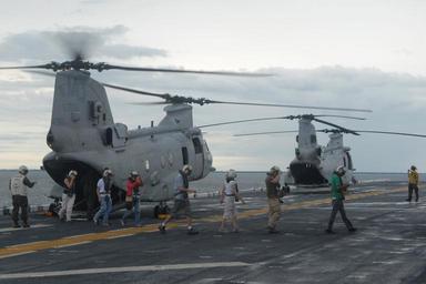 Keywords: NGO's visit USS Iwo Jima DVIDS308210.jpg en Non-governmental organization personnel depart a U S Marine Corps CH-46E Sea Knight helicopter aboard the amphibious assault ship USS Iwo Jima during Continuing Promise 2010 The assigned medical and engineering staff embarked aboard Iwo Jima are working with partner nation teams to provide medical dental veterinary and engineering assistance to several different nations 2010-08-08 https //www dvidshub net/image/308210 100808-N-+++++-017 2010-08-10 09 47 USS IWO JIMA AT SEA PD-USGov-Military-Navy Continuing Promise 2010 Images from US Navy location Iwo Jima Japan Images from DoD uploaded by Fæ |
