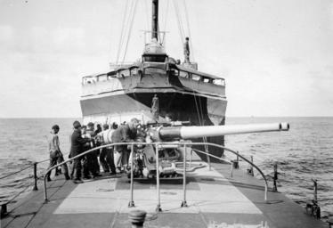 | Keywords: blackandwhite monochrome outdoor black and white NH 50010: USS Stockton (Destroyer # 73), twin 4"/50 gun mount in action on the destroyer's forecastle, 1918. Note the pattern camouflage painted on the face of Stockton's forward superstructure, and the pipe rails installed to keep the gun from firing into the ship's structure. This photograph was long identified as having been taken on either USS Hovey (DD-208) or USS Long (DD-209). However, neither of these ships was in service until October 1919, about a year after the photo was taken. Camouflage pattern confirms identification as Stockton, which is listed in the 1919 "Ships' Data" book as carrying one twin and three single four-inch guns. Also note the sea boots worn by several of the gun crew members. U.S. Naval History and Heritage Command Photograph. NH 50010: USS Stockton (Destroyer # 73), twin 4"/50 gun mount in action on the destroyer's forecastle, 1918. Note the pattern camouflage painted on the face of Stockton's forward superstructure, and the pipe rails installed to keep the gun from firing into the ship's structure. This photograph was long identified as having been taken on either USS Hovey (DD-208) or USS Long (DD-209). However, neither of these ships was in service until October 1919, about a year after the photo was taken. Camouflage pattern confirms identification as Stockton, which is listed in the 1919 "Ships' Data" book as carrying one twin and three single four-inch guns. Also note the sea boots worn by several of the gun crew members. U.S. Naval History and Heritage Command Photograph. |