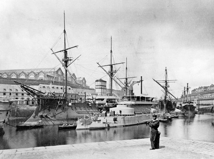 | Keywords: blackandwhite monochrome outdoor boat vehicle black and white NH 74894: Tempéte (French Coast Defense Ship, 1876), right center, and Redoutable (French Battleship, 1876), left center, moored off Brest navy yard, France circa the late 1870s or early 1880s. In the distance, beyond Tempéte's stern, are a Colbert class battleship, with a Victorieuse class armored cruiser off its port side. Note the French sailor in the foreground, leaning on what appears to be an old cannon partially buried for use as a bollard. The original print is in an Office of Naval Intelligence album of French warship photographs. Courtesy of the Naval Historical Foundation, Washington, D.C. U.S. Naval History and Heritage Command Photograph. NH 74894: Tempéte (French Coast Defense Ship, 1876), right center, and Redoutable (French Battleship, 1876), left center, moored off Brest navy yard, France circa the late 1870s or early 1880s. In the distance, beyond Tempéte's stern, are a Colbert class battleship, with a Victorieuse class armored cruiser off its port side. Note the French sailor in the foreground, leaning on what appears to be an old cannon partially buried for use as a bollard. The original print is in an Office of Naval Intelligence album of French warship photographs. Courtesy of the Naval Historical Foundation, Washington, D.C. U.S. Naval History and Heritage Command Photograph. |