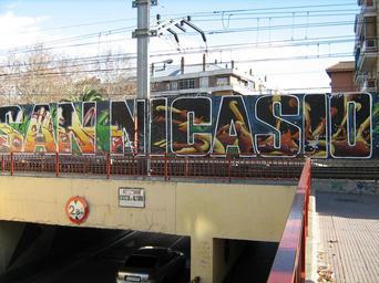 | Keywords: Nicasio27.jpg es Mural en la tapia que delimita la vía del ferrocarril de cercanías C-5 en la salida del barrio de San Nicasio Leganés Comunidad de Madrid own Chaluco San Nicasio Leganés Rail transport in Leganés Railway lines in the Community of Madrid |