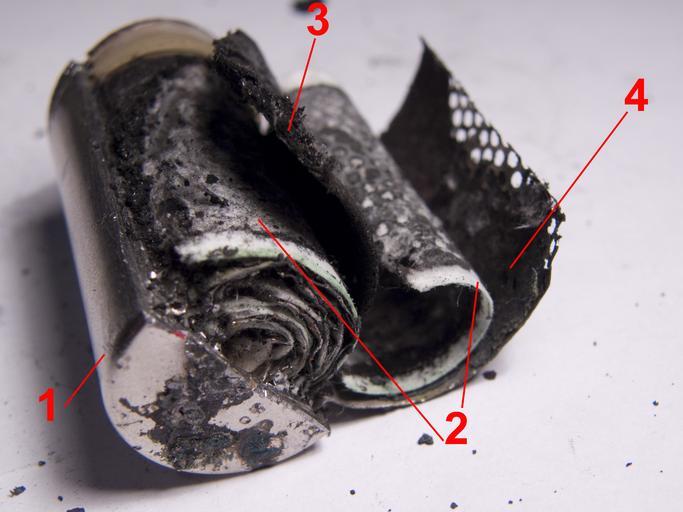 Keywords: Nicd disassembled.jpg en Disassembled Ni-Cd AA cell 1 outer metal casing also negative terminal 2 separator between electrodes 3 positive electrode 4 negative electrode with current collector metal grid connected to metal casing Everything is rolled Construction is very similar to ni-mh cell cs Rozebraný Ni-Cd článek 1 kovový obal zároveň záporný pól 2 separátor 3 kladná elektroda 4 záporná elektroda vodivě spojená s kovovým obalem own Lukas A CZE 2010-04-04 Disassembled batteries Nickel-cadmium batteries AA batteries |