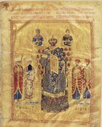 | Keywords: Nicephorus III and officers BnF Coislin79 fol2.jpg  The Byzantine emperor Nicephorus III or possibly Michael VII and the chief four officials of his court From left the proedros and epi tou kanikleiou the eunuch prōtoproedros and prōtovestiarios the emperor flanked by Truth and Justice the proedros and dekanos and the proedros and megas primikērios Ο αυτοκράτορας  ικηφόρος Γ' Βοτανειάτης ή ίσως ο  ιχαήλ Ζ' με τους τέσσερις ε ικεφαλής αυλικούς του Α ό αριστερά ο  ρόεδρος και ε ί του κανικλείου ο ευνούχος  ρωτο ρόεδρος και  ρωτοβεστιάριος ο αυτοκράτωρ με τις αλληγορικές  αραστάσεις της Αλήθειας και της Δικαιοσύνης ο  ρόεδρος και δεκανός και ο  ρόεδρος και μέγας  ριμικήριος L'empereur Nicéphore III et ses courtiers Bibliothèque nationale de France Manuscript Coislin 79 folio 2 between 1074 1081 in Homélies de Jean Chrysostome John Chrysostom Homilies PD-old Coislin 79 2 <gallery> File NicephorusOrMichaelBnFCoislin79Fol2 jpg </gallery> Bibliothèque nationale de France Manuscript Coislin 79 Nicephorus 2 Nicephorus III Michael VII Doukas Medieval miniatures of Byzantine emperors Coislin 2 Byzantine chlamys Byzantine textiles checked |