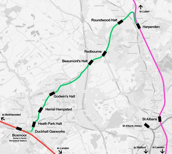 Keywords: Nickey Line map.png en An outline map of the Nicky Line railway in Hertfordshire England UK which closed in 1959 2013-06-02 20 30 17 own Cnbrb cc-zero openstreetmap Uploaded with UploadWizard Nickey Line Public transport maps of the United Kingdom West Coast Main Line Hemel Hempstead railway station Harpenden railway station Midland Railway Midland Main Line Maps of Hertfordshire