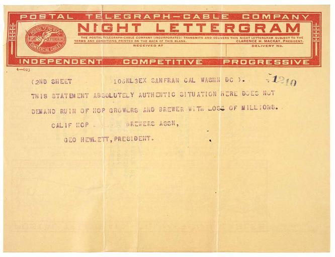 | Keywords: today's document todaysdocument u.s. national archives usnationalarchives april april 28, 1917 april281917 april 28 april28 04/28/1917 04281917 nara:arcid=595308 california hop farm growers lettergram text writing Title: Night Lettergram to John E. Raker from California Hop Growers Production Date: April 28, 1917 Series: Petitions and Memorials, 1813 - 1968; Committee on the Judiciary; Records of the U.S. House of Representatives, 1789 - 2005; Record Group 233; National Archives. Received April 28, 1917, this telegram was sent from the California Hop Growers Association, in protest of a proposed wartime ban on brewing beer. Persistent URL: arcweb.archives.gov/arc/action/ExternalIdSearch?id=595308 Access Restrictions: Unrestricted Use Restrictions: Unrestricted Title: Night Lettergram to John E. Raker from California Hop Growers Production Date: April 28, 1917 Series: Petitions and Memorials, 1813 - 1968; Committee on the Judiciary; Records of the U.S. House of Representatives, 1789 - 2005; Record Group 233; National Archives. Received April 28, 1917, this telegram was sent from the California Hop Growers Association, in protest of a proposed wartime ban on brewing beer. Persistent URL: arcweb.archives.gov/arc/action/ExternalIdSearch?id=595308 Access Restrictions: Unrestricted Use Restrictions: Unrestricted |