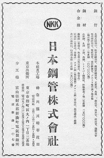 Keywords: Nihon Kokan advertisement in 1930s.jpg Nihon Kokan advertisement in 1930s 1930年代の日 鋼管広告 Japanese book The history of Greater Tokyo Chapter of Showa era published by Gendai-Tsushin Sha 現代 信社 大 京発達史・昭和編 より 1930s 1930年代 author Notes This file was scanned and edited by the uploader Abasaa ファイルはあばさーによりスキャンおよび編集されました PD-Japan Advertisements in Japan JFE Group |