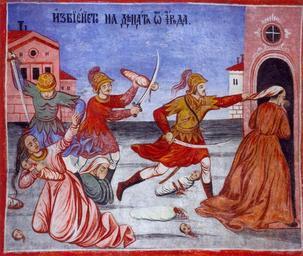 Keywords: Nikola-Obrazopisov-Belyova-church-Massacre-of-the-Innocents-1869.jpg Избиването на децата от И од стенопис в Бельова цъ ква Mural Massacre of the Innocents in Belyova church Скани ана от икола Иванов Об азописов издание на Самоковския исто ически музей 2009 ISBN 978-954-8623-05-6 Scanned from Nikola Ivanov Obrazopisov edition of Samokov History Museum 2009 ISBN 978-954-8623-05-6 1869 Creator Nikola Obrazopisov Nikola Obrazopisov 1829-1915 PD-old-100 Nikola Obrazopisov Belyova Church Samokov History Museum Frescos of the Massacre of the Innocents Swaddling in paintings