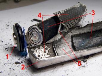 Keywords: Nimh disassembled.jpg en Disassembled Ni-Mh AA cell 1 positive terminal 2 outer metal casing also negative terminal 3 positive electrode 4 negative electrode with current collector metal grid connected to metal casing 5 separator between electrodes cs Otevřený AA Ni-Mh článek 1 kladný pól 2 kovový obal článku zároveň záporný pól 3 kladná elektroda 4 záporná elektroda se sběračem proudu -kovová mřížka vodivě spojená s vnějším obalem 5 separátor mezi elektordami own Czatlantis 3 4 2010 Disassembled batteries NiMH batteries AA batteries |