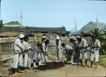 | Keywords: Nine-man shovel, Korea, (s.d.) (Taylor box21num15).jpg en <br> Nine-man shovel Korea s d Nearly all Korean labor methods are unique Actual experiment has demonstrated that nine or six or even three men using this kind of hand-digging shovel can do more work more easily than the same number of men vigorously using individual shovels Date created 1908/1922 Publisher of the Digital Version University of Southern California Libraries Repository Name Methodist Church U S Legacy Record ID kda-m82 Photographer Methodist Episcopal Church Format photograph Archival file kda_Volume42/Taylor_box21num15 jpg Rights Neither the General Conference nor any General Agency of The United Methodist Church successor to the Methodist Episcopal Church claims any interest in the photos or images Filename Taylor_box21num15 Coverage date 1908/1922 Contributing entity University of Southern California Repository Address Nashville Tennessee Part of collection Korean Digital Archive Donor Taylor Ewing Bevard Type images Part of subcollection The Reverend Corwin Nellie Taylor Collection Geographic Subject Country Korea Compiler Taylor Corwin; Blood-Taylor Nellie 1908/1922 Methodist Episcopal Church http //digitallibrary usc edu/cdm/ref/collection/p15799coll48/id/713 PD-Japan-oldphoto Korean archive in the USC digital library Images from USC Digital Library uploaded by Fæ |