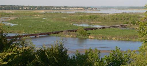 | Keywords: Niobrara State Park bridge E end.JPG Niobrara River Bridge near the mouth of the Niobrara in Knox County Nebraska ; seen from the southwest upstream The bridge was built in 1929 to carry the Chicago and North Western Railroad across the Niobrara immediately upstream from its confluence with the Missouri It consists of three rigid-connected Warren through truss spans at the west end then seven steel plate through girders then 29 timber stringer approach spans over the floodplain to the east It is now a part of Niobrara State Park where it serves as a footbridge The bridge is listed in the National Register of Historic Places The Missouri River flows from left to right in the background of the photo; visible near the upper right corner is Chief Standing Bear Memorial Bridge own Ammodramus 2010-05-08 Pictures by Ammodramus Taken with Panasonic Lumix DMC-FZ20 Niobrara State Park bridge |