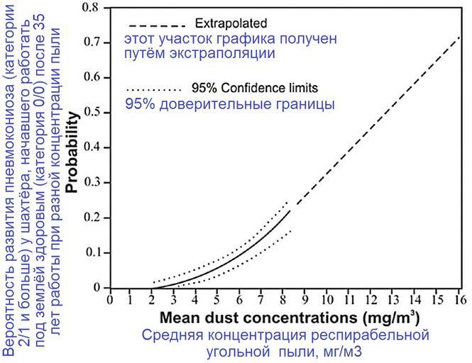 Keywords: NIOSH-2011-03+.jpg ru Рисунок 3 из обзо а п офзаболеваний шахтё ов http //www cdc gov/niosh/docs/2011-172/pdfs/2011-172 pdf Coal Mine Dust Exposures and Associated Health Outcomes Ве оятность того что здо овый шахтё катего ия пневмокониоза 0/0 после 35 лет аботы заболеет пневмокониозом п и азной концент ации еспи абельной пыли Ве оятность того что шахтё со стажем подземной аботы 35 лет заболеет пневмокониозом катего ия 2/1 и выше п и азной концент ации еспи абельной угольной пыли вычислена по данным английского исследования 1971г Видно что п и концент ации менее 2 мг/м3 ве оятность близка к нулю а п и концент ации 16 мг/м3 близка в 70 Источник 1 4 en Figure 3 Probability that an individual starting with no pneumoconiosis category 0/0 will be classified as 2/1 or greater after 35 years of exposure to various concentrations of coal mine dust Figure 7 2 of the CCD 1 Source Jacobsen et al 4 2015-04-21 http //www cdc gov/niosh/docs/2011-172/pdfs/2011-172 pdf Coal Mine Dust Exposures and Associated Health Outcomes A Review of Information Published Since 1995 Michael Attfield et al NIOSH USA other versions PD-USGov National Institute for Occupational Safety and Health Mining Workplace safety Workplace safety of Russia Occupational diseases Miners Uploaded with UploadWizard |