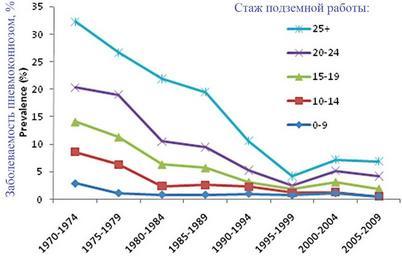 Keywords: NIOSH-2011-07+.jpg ru Рисунок 7 из обзо а п офзаболеваний шахтё ов http //www cdc gov/niosh/docs/2011-172/pdfs/2011-172 pdf Coal Mine Dust Exposures and Associated Health Outcomes Заболеваемость пневмокониозом катего ии 1 и выше у аме иканских шахтё ов-угольщиков за пе иод 1970-2009г в зависимости от стажа Видно что до 1999г она снижалась а потом снова начала асти Источник NIOSH CWXSP data en Figure 7 Percentage of miners examined with CWP category 1 or greater from the NIOSH Coal Workers X-ray Program from 1970 2009 by tenure in coal mining Source NIOSH CWXSP data 2015-04-21 http //www cdc gov/niosh/docs/2011-172/pdfs/2011-172 pdf Coal Mine Dust Exposures and Associated Health Outcomes A Review of Information Published Since 1995 Michael Attfield et al NIOSH USA other versions PD-USGov National Institute for Occupational Safety and Health Mining Workplace safety Workplace safety of Russia Occupational diseases Miners Uploaded with UploadWizard |