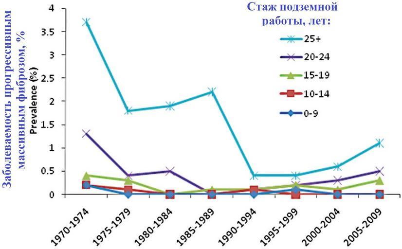 Keywords: NIOSH-2011-08+.jpg ru Рисунок 8 из обзо а п офзаболеваний шахтё ов http //www cdc gov/niosh/docs/2011-172/pdfs/2011-172 pdf Coal Mine Dust Exposures and Associated Health Outcomes заболеваемость п ог ессивным массивным фиб озом у аме иканских шахтё ов-угольщиков за пе иод 1970-2009г в зависимости от стажа Видно что до 1999 г она снижалась а потом снова начала асти Источник NIOSH CWXSP data en Figure 8 Percentage of miners examined with PMF from the NIOSH Coal Workers X-ray Program from 1970 2009 by tenure in coal mining Source NIOSH CWXSP data 2015-04-21 http //www cdc gov/niosh/docs/2011-172/pdfs/2011-172 pdf Coal Mine Dust Exposures and Associated Health Outcomes A Review of Information Published Since 1995 Michael Attfield et al NIOSH USA other versions PD-USGov National Institute for Occupational Safety and Health Mining Workplace safety Workplace safety of Russia Occupational diseases Miners Uploaded with UploadWizard |