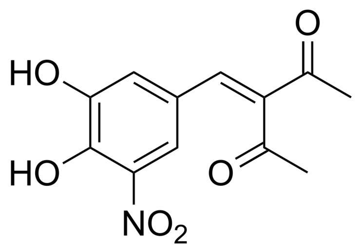 Keywords: Nitecapone.svg Chemical structure of nitecapone Own 15 00 21 May 2012 UTC Ed Edgar181 Diketones Catechols Nitrophenols Nervous system drugs