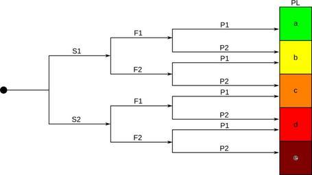 | Keywords: Niveau risque iso13849-1.svg en Risk assessment method according the the standard ISO 13849-1 2008 Factors S severity of the injury S1 light wound reversible S2 severe wound irreversible including death ; F frequency and/or duration of the exposure to danger F1 rare to quite frequent and/or short duration F2 frequent to continuous and/or long duration; P possibility to avoid the danger or mitigate its consequencies P1 possible under given circumstances P2 rarely possible PL performance level fr Analyse du risque selon la norme ISO 13849-1 2008 Facteurs S gravité de la blessure S1 blessure légère normalement réversible S2 blessure grave normalement irréversible y compris le décès ; F fréquence et/ou durée d'exposition au phénomène dangereux F1 rare à assez fréquente et/ou courte durée d'exposition F2 fréquente à continue et/ou longue durée d'exposition ; P possibilité d'éviter le phénomène dangereux ou de limiter le dommage P1 possible sous certaines conditions P2 rarement possible PL niveau de performance 2012-05-02 own Cdang File Risikograf13849 jpg inkscape cc-zero Uploaded with UploadWizard Risk management |