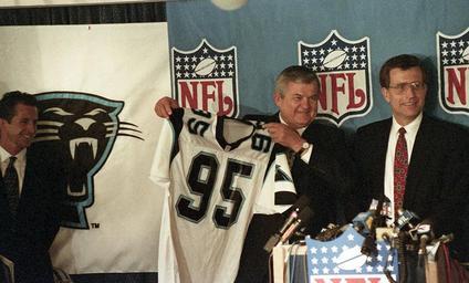 Keywords: Jerry and Mark Richardson with Carolina Panthers NFL shirts and logo, Rosemont, IL, October 27, 1993. At the league meeting in Chicago the day before (on October 26, 1993), NFL owners unanimously selected the Carolinas as the 29th NFL franchise and the first expansion team since 1976. From the News and Observer Negative Collection, State Archives of North Carolina, Raleigh, NC. Copyright owned by The Raleigh News & Observer newspaper. DO NOT USE OR PUBLISH WITHOUT EXPRESSED PERMISSION FROM THE N&O. Jerry and Mark Richardson with Carolina Panthers NFL shirts and logo, Rosemont, IL, October 27, 1993. At the league meeting in Chicago the day before (on October 26, 1993), NFL owners unanimously selected the Carolinas as the 29th NFL franchise and the first expansion team since 1976. From the News and Observer Negative Collection, State Archives of North Carolina, Raleigh, NC. Copyright owned by The Raleigh News & Observer newspaper. DO NOT USE OR PUBLISH WITHOUT EXPRESSED PERMISSION FROM THE N&O. |