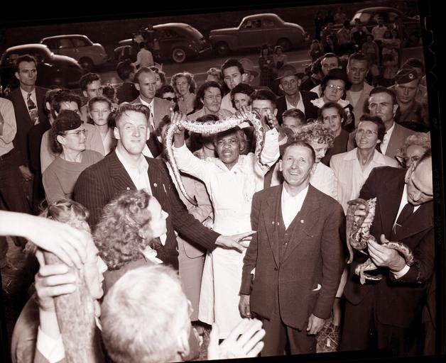 | Keywords: snake handlers snakehandlers zion tabernacle ziontabernacle durham (n.c.) durhamnc churches snakes groupshot people monochrome Durham, NC, Zion Tabernacle, 1949, practiced the handling of poisonous snakes. Rev. Colonel Hartman Bunn, church leader, is thought to be the tall man on the left in the dark suit. From the Raleigh News and Observer negatives, State Archives of North Carolina, Raleigh, NC. COPYRIGHT OWNED BY THE RALEIGH NEWS AND OBSERVER NEWSPAPER. DO NOT USE OR PUBLISH WITHOUT EXPRESSED PERMISSION FROM THE N&O. Durham, NC, Zion Tabernacle, 1949, practiced the handling of poisonous snakes. Rev. Colonel Hartman Bunn, church leader, is thought to be the tall man on the left in the dark suit. From the Raleigh News and Observer negatives, State Archives of North Carolina, Raleigh, NC. COPYRIGHT OWNED BY THE RALEIGH NEWS AND OBSERVER NEWSPAPER. DO NOT USE OR PUBLISH WITHOUT EXPRESSED PERMISSION FROM THE N&O. |
