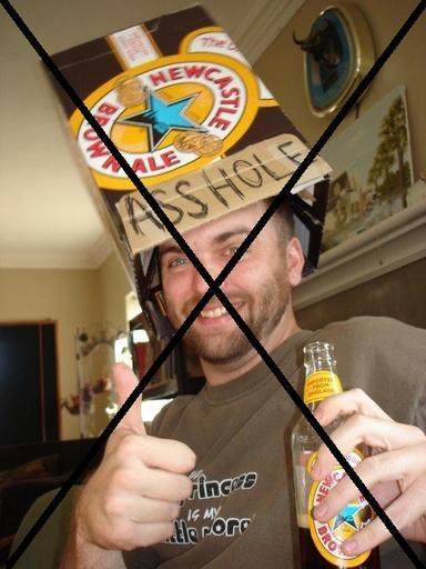 Keywords: No Assholes.jpg Created by ENDelt260 File Asshole hat jpg Adapted by Dr Blofeld 2012-09-22 own assumed Blofeld Dr Paper hats Men with beards Thumbs up Men looking at viewer People with beer bottles Black crosses Anti logos