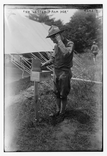 | Keywords: "No letter from HER?" -- (soldier's plea) (LOC) (18958790963).jpg Bain News Service publisher No letter from HER -- soldier's plea between ca 1915 and ca 1920 1 negative glass ; 5 x 7 in or smaller Notes Title from data provided by the Bain News Service on the negative Forms part of George Grantham Bain Collection Library of Congress Format Glass negatives Rights Info No known restrictions on publication Repository Library of Congress Prints and Photographs Division Washington D C 20540 USA http //hdl loc gov/loc pnp/pp print hdl loc gov/loc pnp/pp print General information about the Bain Collection is available at http //hdl loc gov/loc pnp/pp ggbain hdl loc gov/loc pnp/pp ggbain Higher resolution image is available Persistent URL http //hdl loc gov/loc pnp/ggbain 24662 hdl loc gov/loc pnp/ggbain 24662 Call Number LC-B2- 4242-4 https //www flickr com/photos/library_of_congress/18958790963/ No letter from HER -- soldier's plea LOC LOC-image ggbain 24662 https //www flickr com/people/8623220 N02 The Library of Congress http //www loc gov/rr/print/195_copr html noknown The Library of Congress Flickr Commons PD-Bain The Library of Congress https //flickr com/photos/8623220 N02/18958790963 2016-09-08 07 56 19 pd Uncategorized 2016 December 20 |